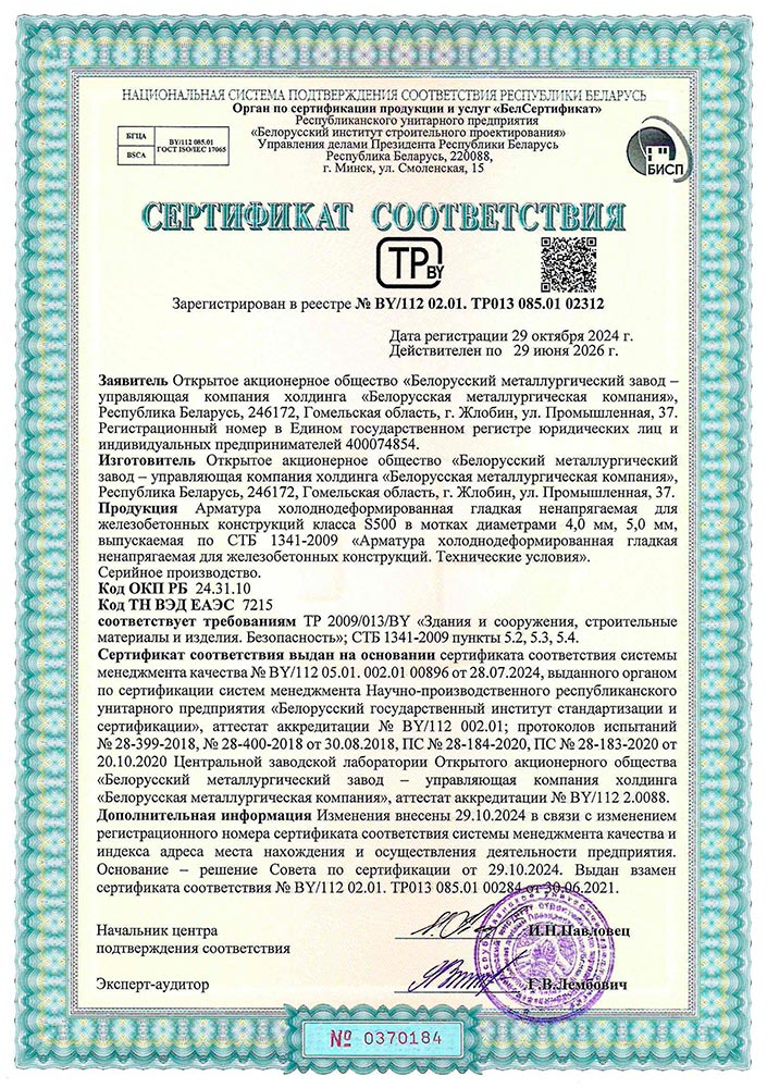 Сертификат № BY/112 02.01. ТР013 085.01 00284, (Госстандарт РБ) на производство арматуры холоднодеформированной гладкой ненапрягаемой для железобетонных конструкций класса S500 в мотках Ø 4,0-5,0 мм по требованиям СТБ 1341-2009. | БМЗ
