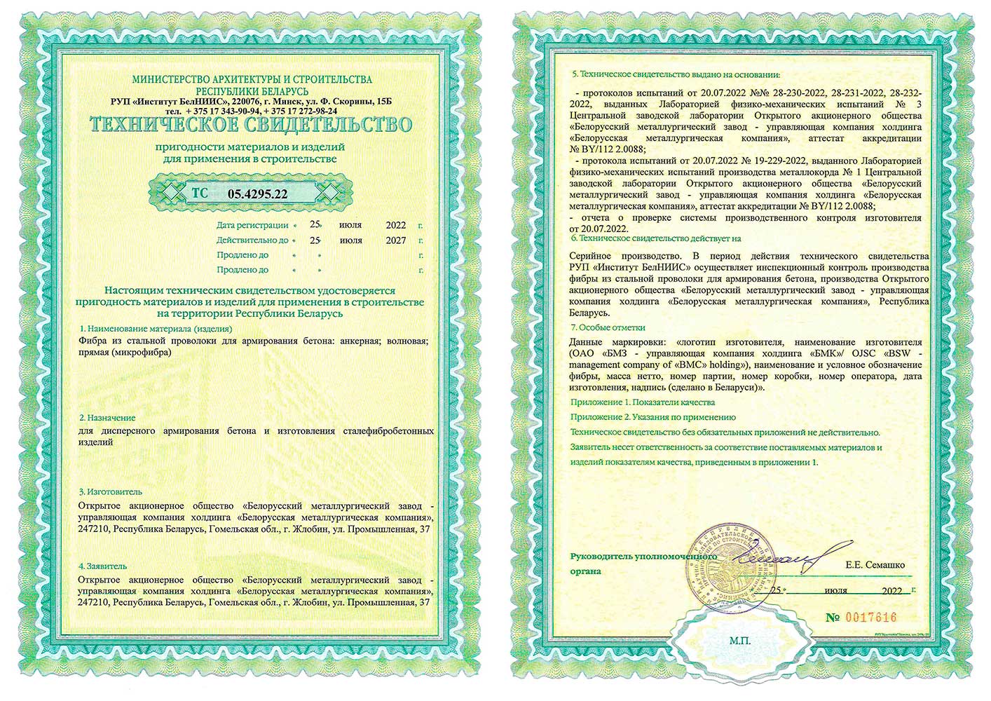 Техническое свидетельство № ТС 05.4295.22 (Министерство архитектуры и строительства РБ) на производство фибры (анкерной, волновой, прямой) из стальной проволоки для армирования бетона по требованиям ТУ BY 400074854.628-2011 | БМЗ