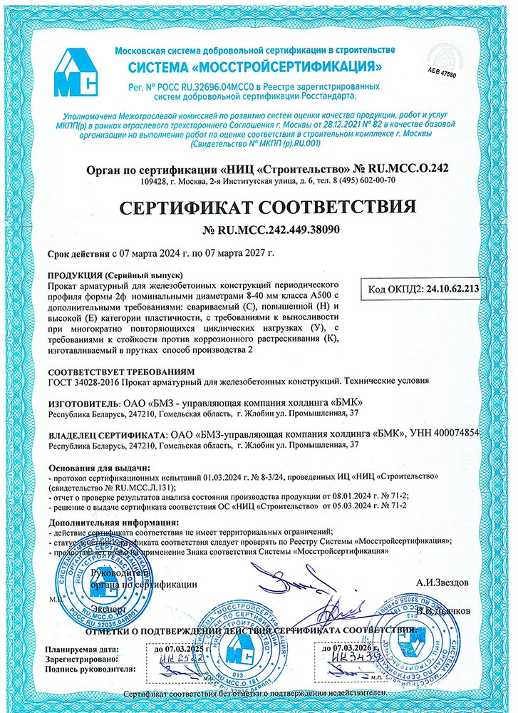 Сертификат № RU.MCC.242.449.38090 «Мосстройсертификация» на производство проката арматурного для ж/б конструкций периодического профиля формы 2ф Ø 8-40 мм класса А500 с дополнительными требованиями: С, Н, Е, У, К в прутках по требованиям ГОСТ 34028-2016 | БМЗ