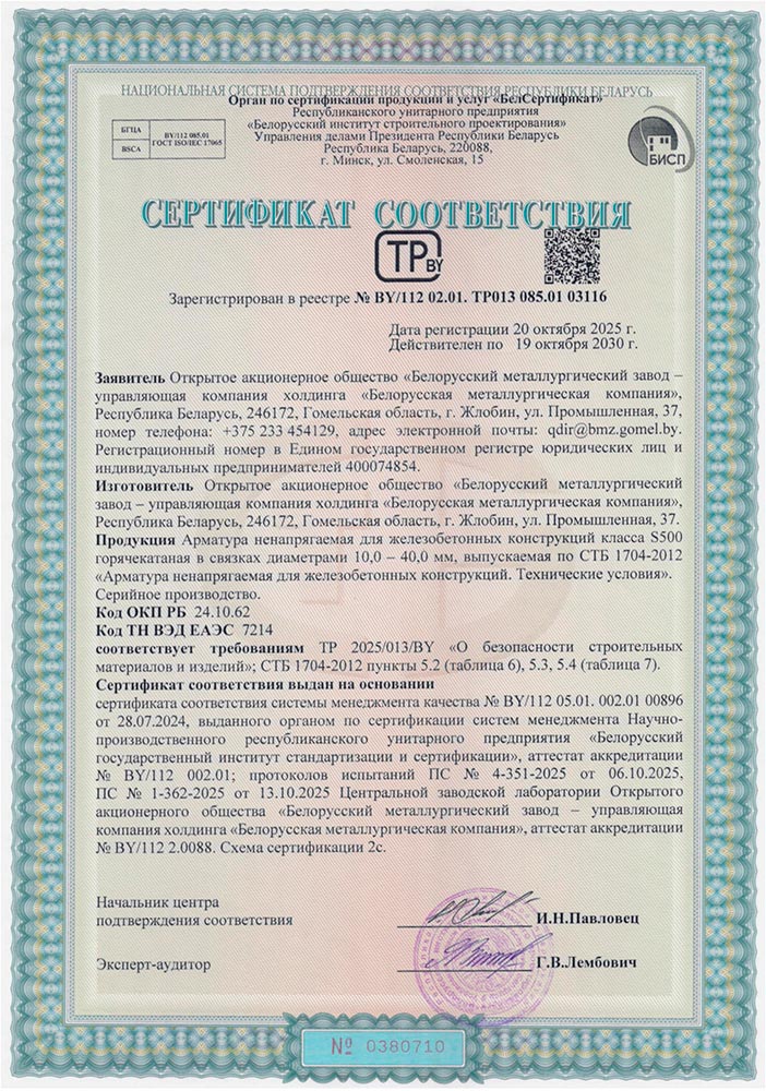 Сертификат № BY/112 02.01. ТР013 085.01 03116 (Госстандарт РБ) на производство арматуры ненапрягаемой для железобетонных конструкций класса S500 горячекатаной в связках Ø 10-40 мм по требованиям СТБ 1704-2012 и ТР 2025/013/BY «О безопасности строительных материалов и изделий» | БМЗ