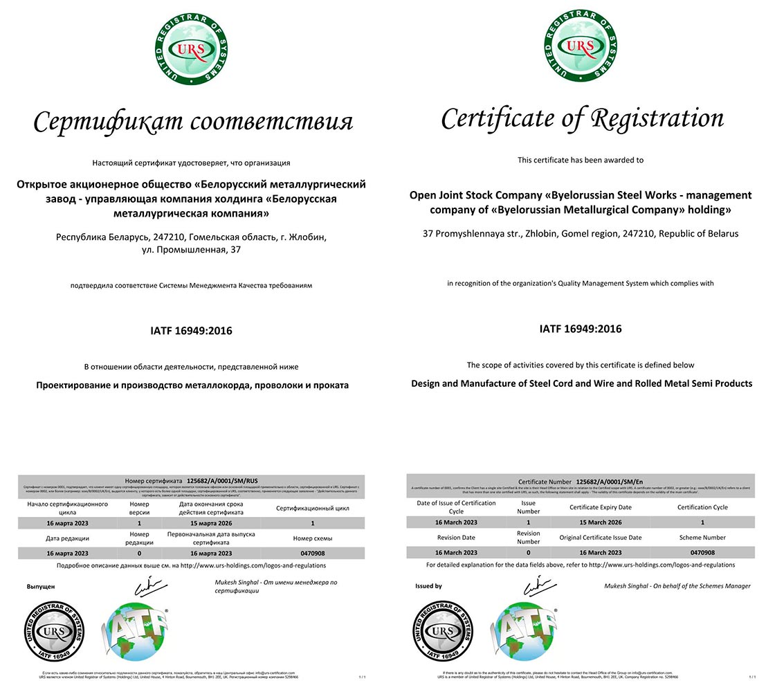 Сертификат № 125682/A/0001/SM (ООО «ЮРС-РУСЬ», РФ (URS)) соответствия СМК требованиям международного стандарта IATF 16949:2016 на проектирование и производство металлокорда, проволоки и проката