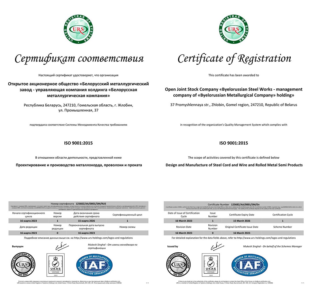 Сертификат № 125682/AA/0001/SM (ООО «ЮРС-РУСЬ», РФ (URS)) соответствия СМК требованиям международного ISO 9001:2015 на проектирование и производство металлокорда, проволоки и проката